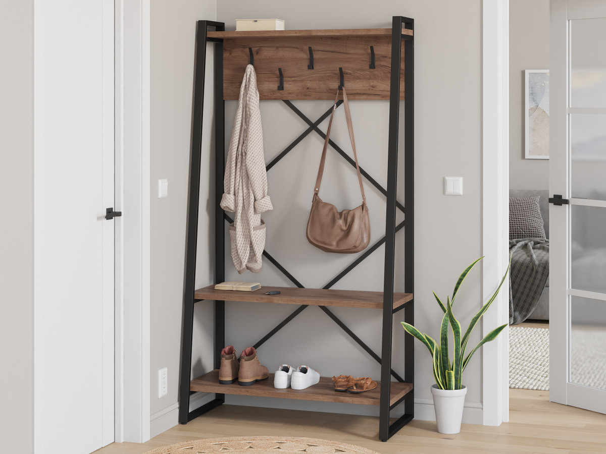 - Высота конструкции 1870 мм позволяет удобно размещать верхнюю одежду и сумки на крючках, а также использовать две вместительные полки для хранения обуви и коробок.