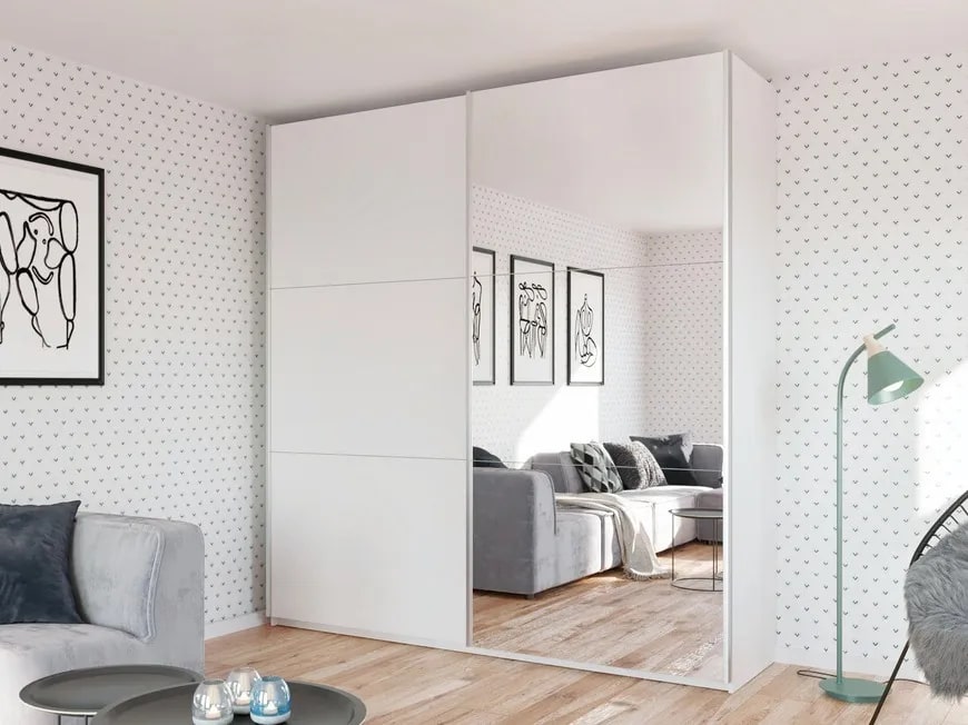 Шкаф-купе Эдельвейс подойдет для современных, скандинавских, минималистичных и светлых интерьеров. Белый цвет гармонирует со многими цветами стен и пола, а зеркальная поверхность добавляет простора.