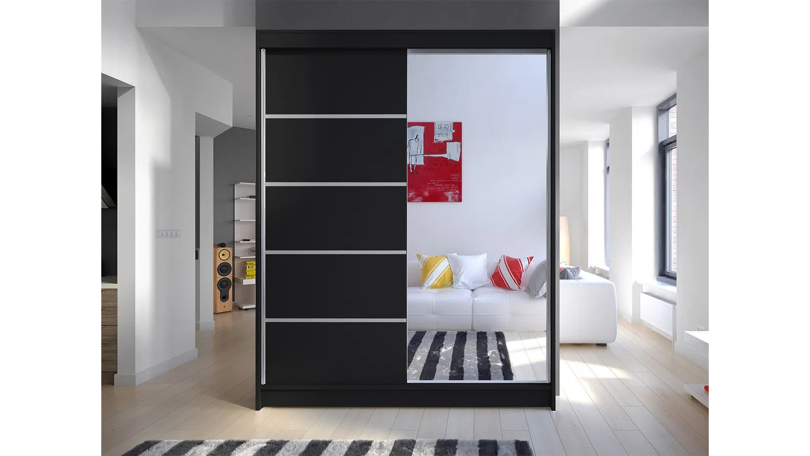 - Зеркальная дверь делает шкаф универсальным для спальни, коридора или гостиной, визуально увеличивая пространство.