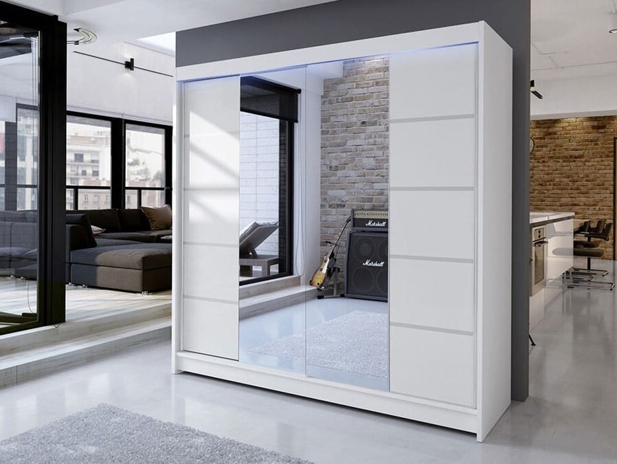 Шкаф-купе Владана 2, белый от бренда Фиеста — современное решение для хранения одежды и аксессуаров в спальне, гостиной или прихожей. Лаконичный белый фасад в сочетании с большими зеркальными створками визуально расширяет пространство и делает комнату светлее. Модель гармонично впишется в минималистичный, скандинавский, современный или лофт-интерьер, подчеркивая его чистоту и стиль.
