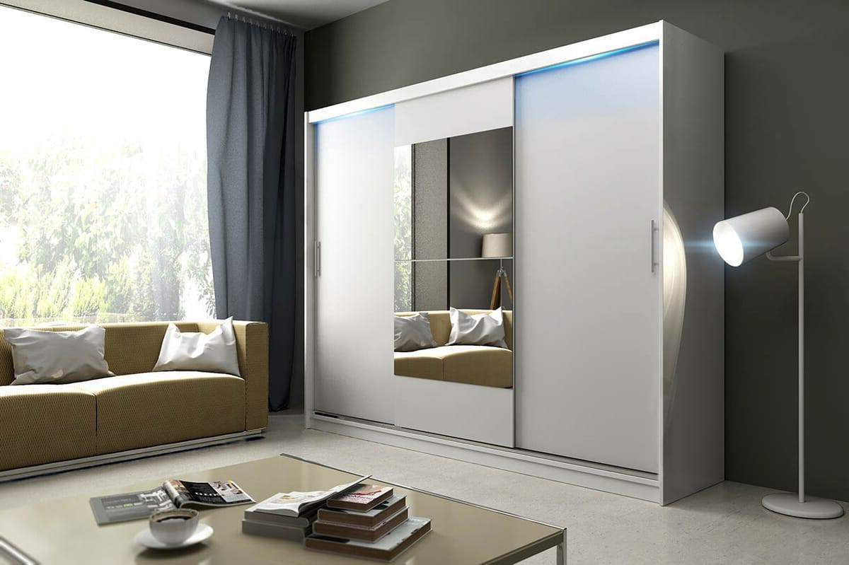 - Зеркало на фасаде помогает быстро подобрать образ и зрительно увеличивает площадь комнаты.