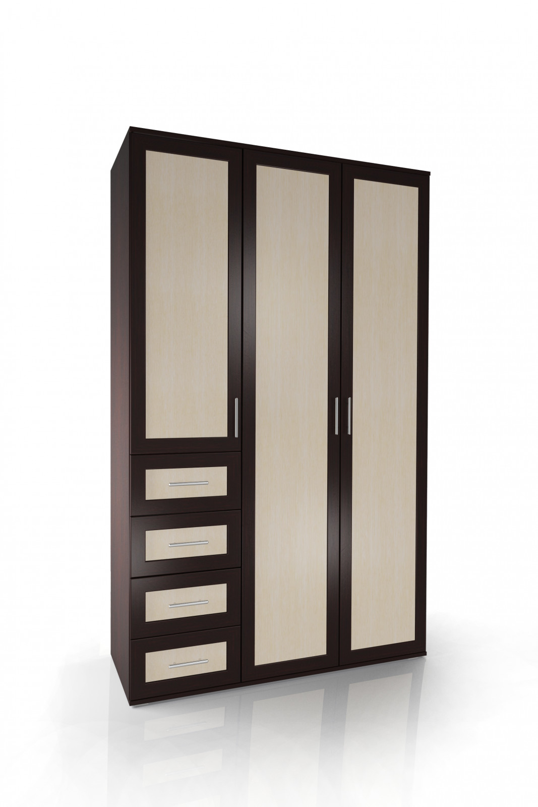 Корпус шкафа изготовлен из прочной ЛДСП толщиной 16 мм, а фасады украшены рамкой из МДФ. Такое сочетание материалов обеспечивает надежность конструкции и аккуратный внешний вид. Три распашные двери позволяют удобно организовать внутреннее пространство, а четыре вместительных выдвижных ящика отлично подходят для хранения белья, аксессуаров и мелких вещей.