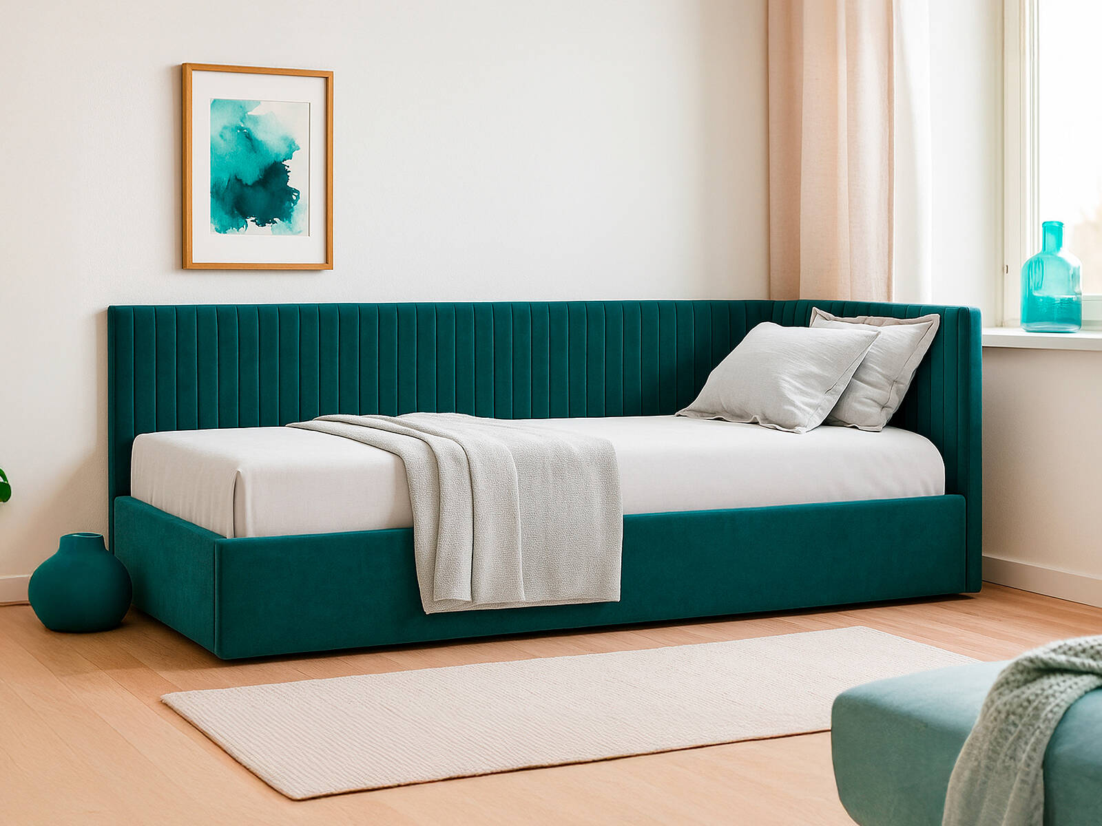 - Мягкие боковые панели обеспечивают дополнительную защиту и комфорт, что особенно актуально для детских и подростковых комнат.