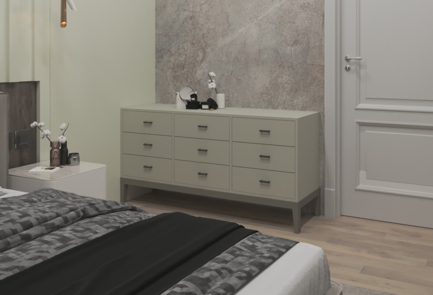 - Комод гармонично сочетается с кроватями и прикроватными тумбами в светлых или темных тонах, акцентными креслами, зеркалами в лаконичных рамах, а также минималистичными коврами.