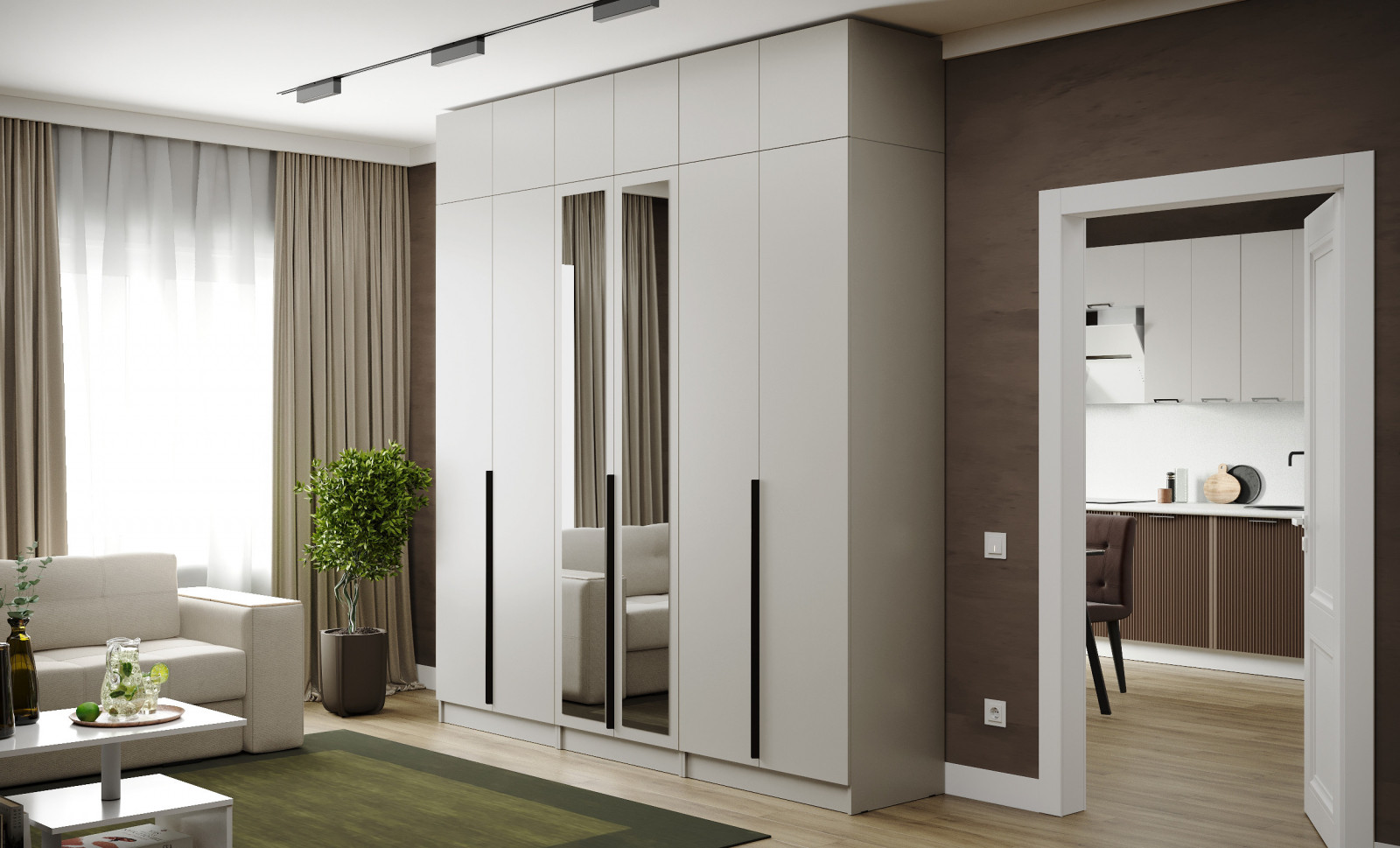 Гардеробная система Domani Мадрид 2,45 м в цвете кашемир — современное решение для хранения одежды и аксессуаров в спальне, прихожей или гардеробной комнате. Элегантный фасад с зеркальными вставками визуально расширяет пространство и добавляет свет, а лаконичный дизайн без лишних деталей гармонично впишется в любой современный интерьер.