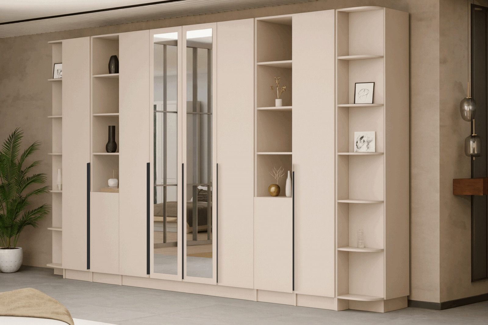 Гардеробная система Domani Мадрид 3,9м в цвете кашемир — современное решение для хранения одежды и аксессуаров в спальне, прихожей или просторной гардеробной. Система сочетает лаконичный дизайн с функциональностью: высокие корпуса, элегантные зеркальные фасады и открытые секции делают интерьер светлее и визуально увеличивают пространство.