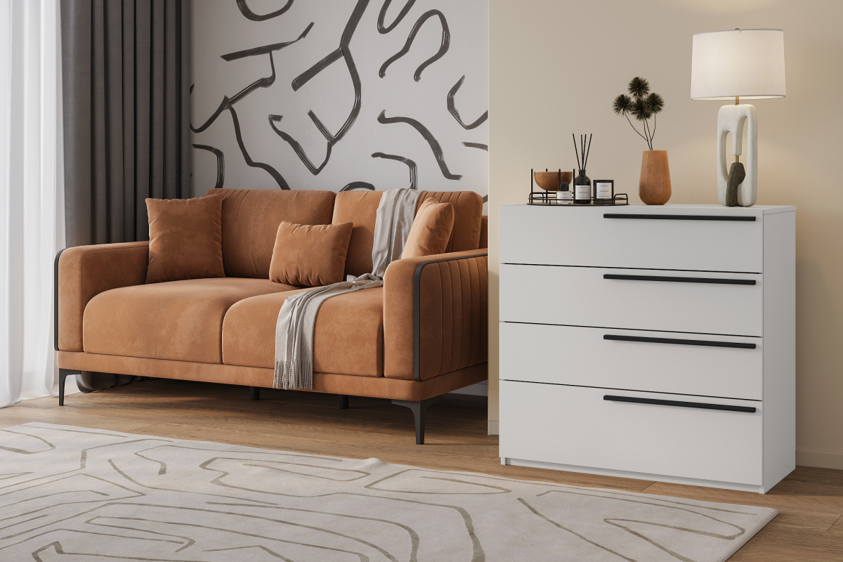 На верхней поверхности комода Fiesta Лорена Пакс-4 отлично смотрятся настольные лампы, стильные вазы, аромадиффузоры или небольшие декоративные аксессуары. Используйте корзинки и органайзеры внутри ящиков для аккуратного хранения белья, детских игрушек, документов или сезонных аксессуаров. Этот комод гармонично сочетается с мягкой мебелью в нейтральных и тёплых оттенках, журнальными столиками в стиле лофт или сканди, а также коврами с геометрическим рисунком. Отличное решение для современных, минималистичных, скандинавских и городских интерьеров.