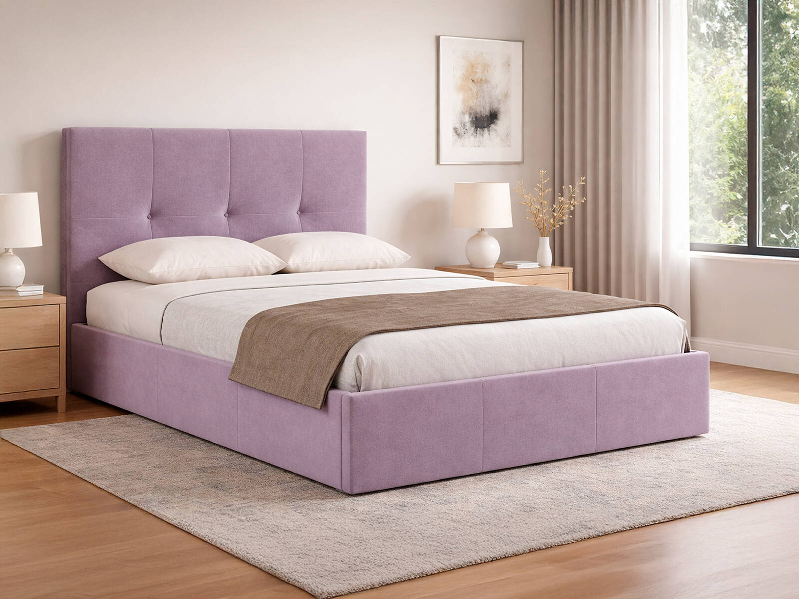 Лавандовый оттенок кровати прекрасно сочетается с пастельными стенами, серебристыми или белыми прикроватными тумбами, а также с мягким ковром. Чтобы создать гармоничное пространство, дополните спальню текстилем в сдержанных тонах и декоративными подушками. К кровати подойдут лаконичные светильники, настенные бра или торшеры в современном стиле. Модель органично впишется в минималистичный, скандинавский или современный интерьер.