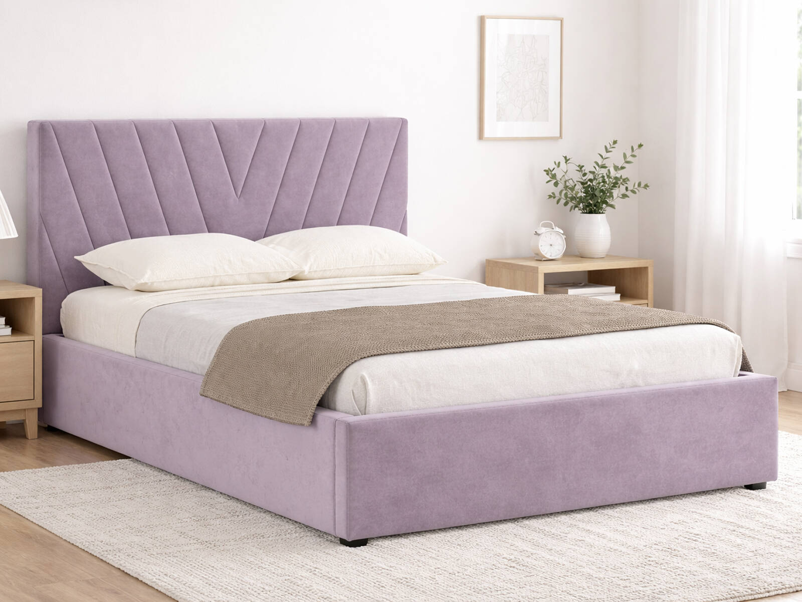 - Кровать станет акцентом спальни, а лавандовый оттенок легко сочетается с пастельными и нейтральными цветами стен и текстиля.