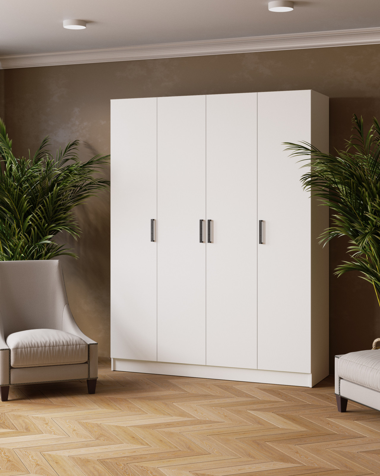 Конструкция шкафа продумана до мелочей: удобная распашная система с плавными петлями Boyard/Marshall, просторная металлическая штанга для одежды и эргономичные ручки делают ежедневное использование по-настоящему комфортным.
