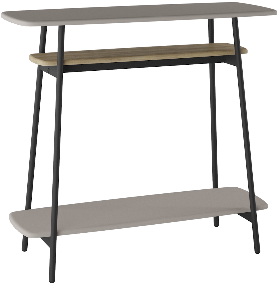 Консоль имеет металлический каркас с защитными подпятниками, дополнительную полочку с текстурой под дерево, скругленные края столешницы.