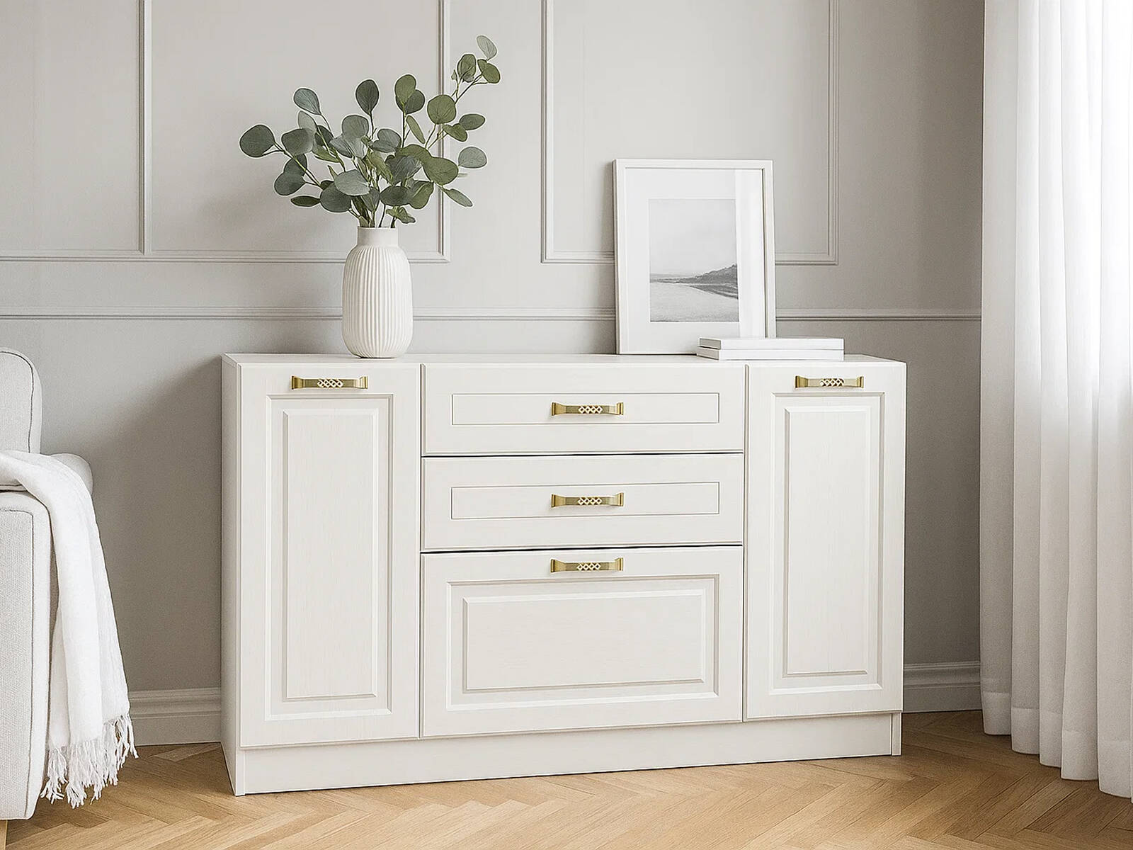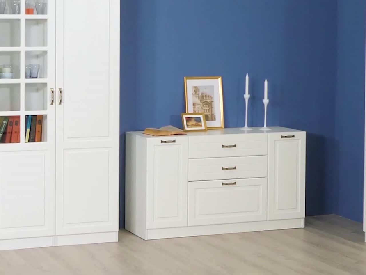Комбинированный комод, практично совмещающий боковые закрытые отделения с внутренней полкой и три выдвижных ящика в центре - солидный вклад в систему хранения.