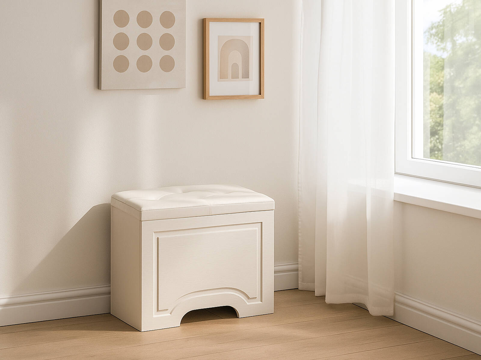 Роскошный пуфик на колёсных опорах с уютной подъёмной крышкой с мягком обивкой из белоснежной эко-кожи с «каретной» стяжкой, так и манит присесть отдохнуть! Под крышкой - вместительное отделение для вещей.