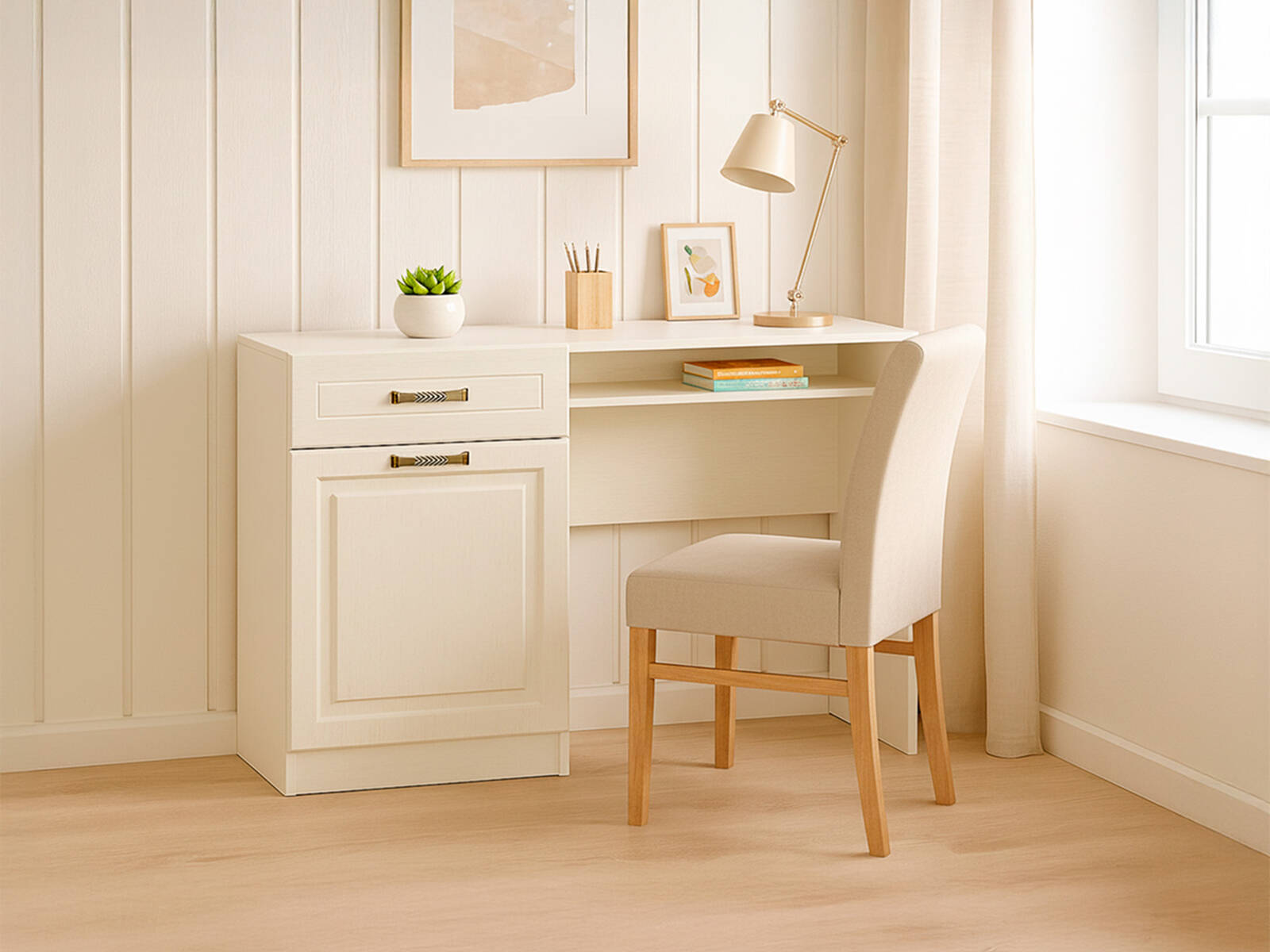 Большая столешница и полка под ней, плюс тумба с выдвижным ящиком и распашным отделением с полкой - раздолье для удобного размещения косметического арсенала Прелестницы! Тумба расположена только слева.