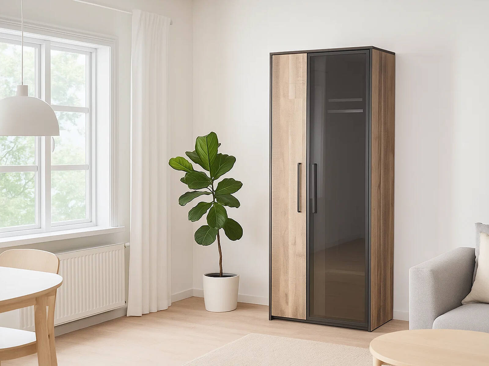 Шкаф Mobi Трувор 13.204 — современное и стильное решение для хранения одежды и аксессуаров в гостиной, спальне или прихожей. Модель сочетает в себе лаконичный дизайн, натуральные древесные оттенки и элегантную вставку из тонированного стекла, что делает шкаф визуально легким и актуальным для современных интерьеров.