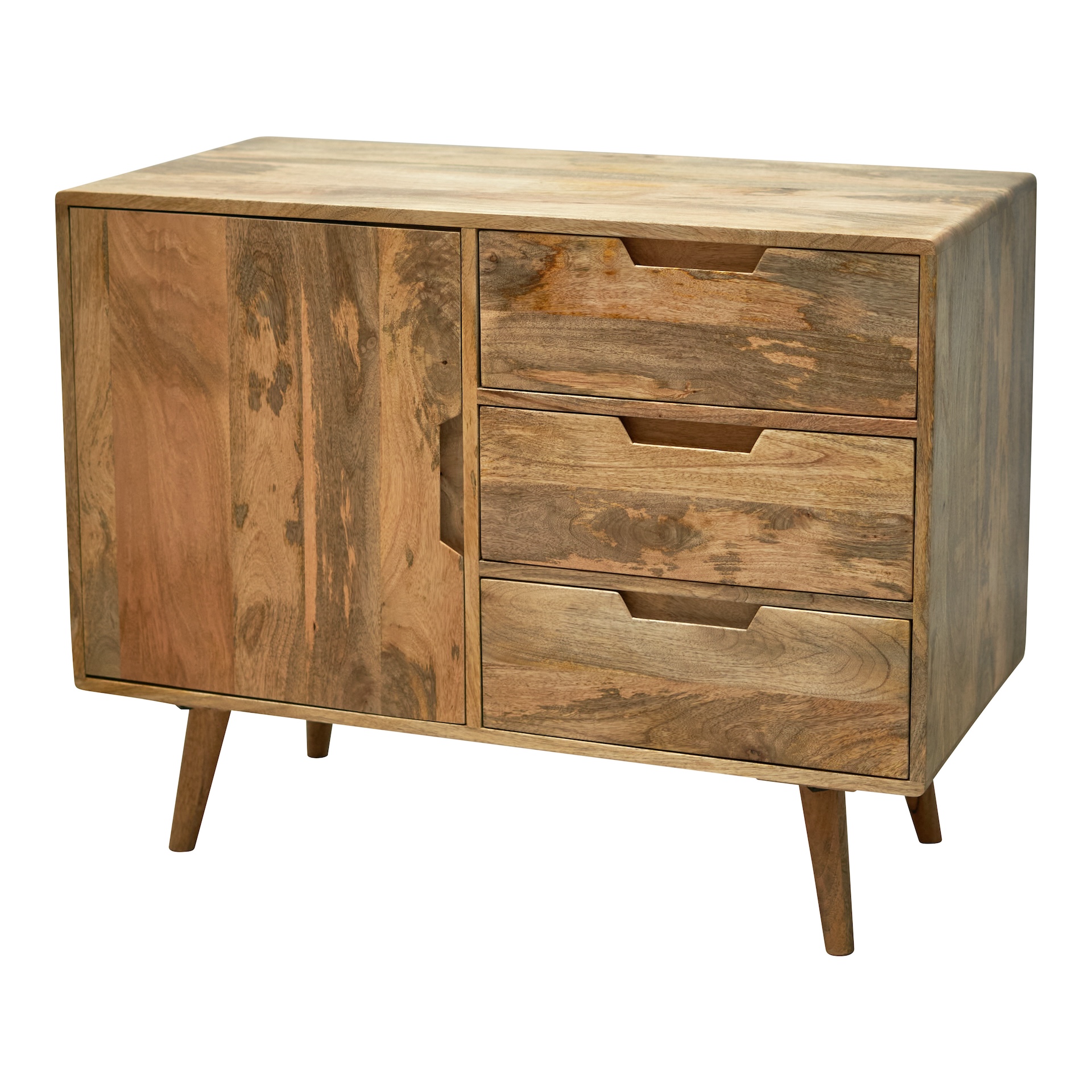 комод с 3 выдвижными ящиками и распашной секцией гладкий фасад, покрытый немецким лаком Plantag c дополнительной защитой от царапин отделка выполнена с сохранением естественной структуры древесины манго установлен на деревянных ножках
