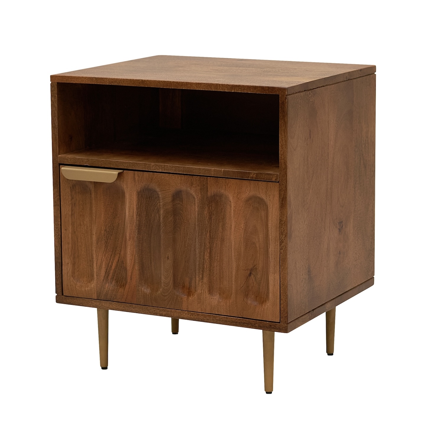 прикроватная тумба с распашной секцией и полкой фасады фрезерованы геометрическим узором отделка выполнена с сохранением естественной структуры древесины манго насыщенный коричневый цвет отборная древесина манго фурнитура с холодным золотистым оттенком изящные металлические ножки