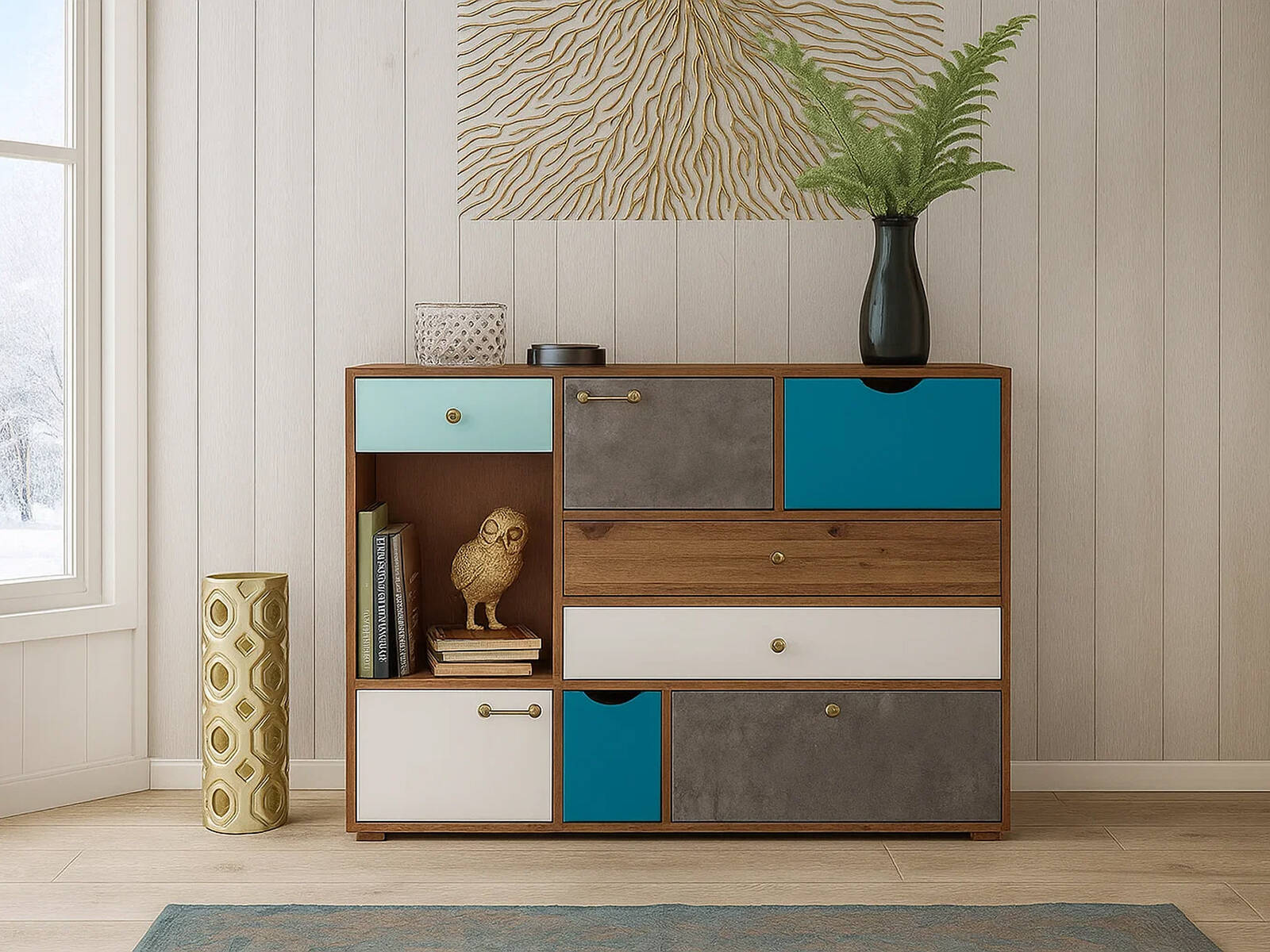Яркий комод Вайс станет отличным дополнением для любого пространства. Изделие сочетает в себе нежные, тёплые цвета и строгие геометрические формы.