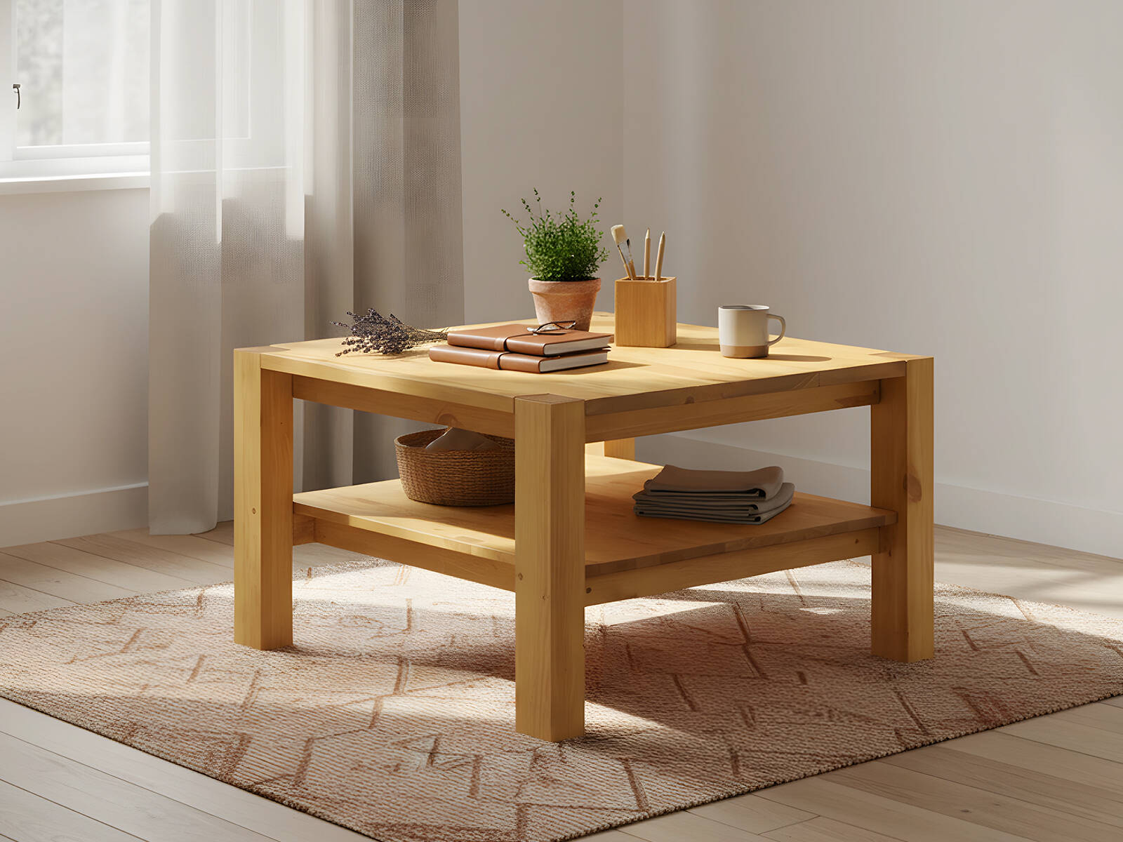 - Прочная конструкция, устойчивая квадратная столешница и дополнительная полка для хранения аксессуаров, книг или декоративных элементов.